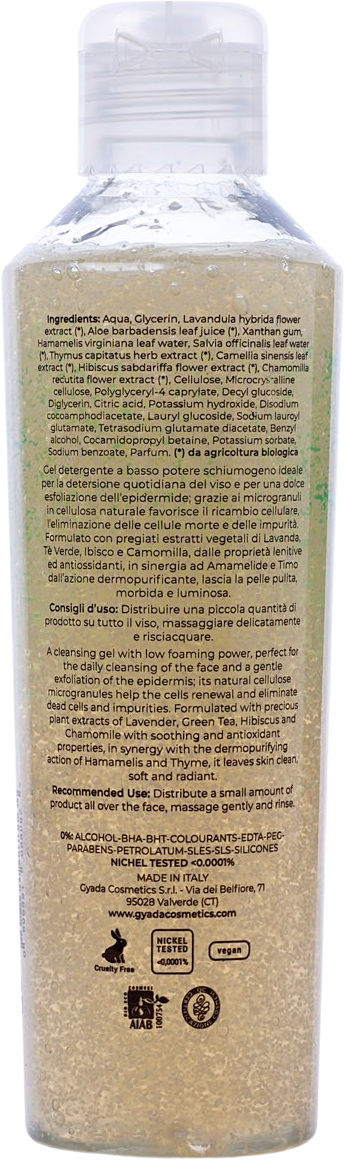 Dieses spezielle Reinigungsgel ist ideal für die tägliche Reinigung und bietet gleichzeitig ein sanftes Peeling der Haut, dank der in der Zusammensetzung enthaltenen Mikrogranulate aus pflanzlicher Cellulose. Diese fördern die Zellerneuerung, beseitigen abgestorbene Hautzellen sowie Unreinheiten. Die Rezeptur schäumt nur wenig und enthält wertvolle Pflanzenextrakte aus Grüntee, Lavendel, Kamille und Hibiskus mit pflegenden sowie antioxidativen Eigenschaften. Diese sorgen in Synergie mit Thymian und Hamamelis für einen hautklärenden Effekt. Es ist ein sehr frisches Produkt, das die Haut sauber, weich und strahlend hinterlässt.