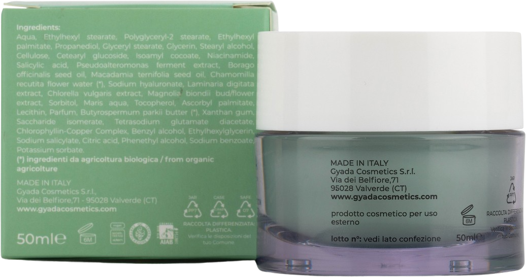 Aqua, Ethylhexyl Stearate, Polyglyceryl-2 Stearate, Ethylhexyl Palmitate, Propandiol, Glyceryl Stearate Se, Glycerin, Stearyl Alcohol, Cellulose, Cetearyl Glucoside, Isoamyl Cocoate, Niacinamide, Salicylic Acid, Pseudoalteromonas Ferment Extract, Borago Officinalis (Borage) Seed Oil, Macadamia Ternifolia Seed Oil, Chamomilla Recutita Flower Water[1], Sodium Hyaluronate, Laminaria Digitata Extract, Chlorella Vulgaris Extract, Magnolia Biondii Bud/Flower Extract, Sorbit, Maris Aqua (Sea Water), Tocopherol (Vitamin E), Ascorbyl Palmitate (Vitamin C), Lecithin, Parfum, Butyrospermum Parkii (Shea) Butter[1], Xanthan Gum, Saccharide Isomerate, Tetrasodium Glutamate Diacetate, CI 75810 (Chlorophyllin-Copper Complex), Benzyl Alcohol, Ethylhexylglycerin, Sodium Salicylate, Citricacid, Phenylethanol, Sodium Benzoate, Potassium Sorbate