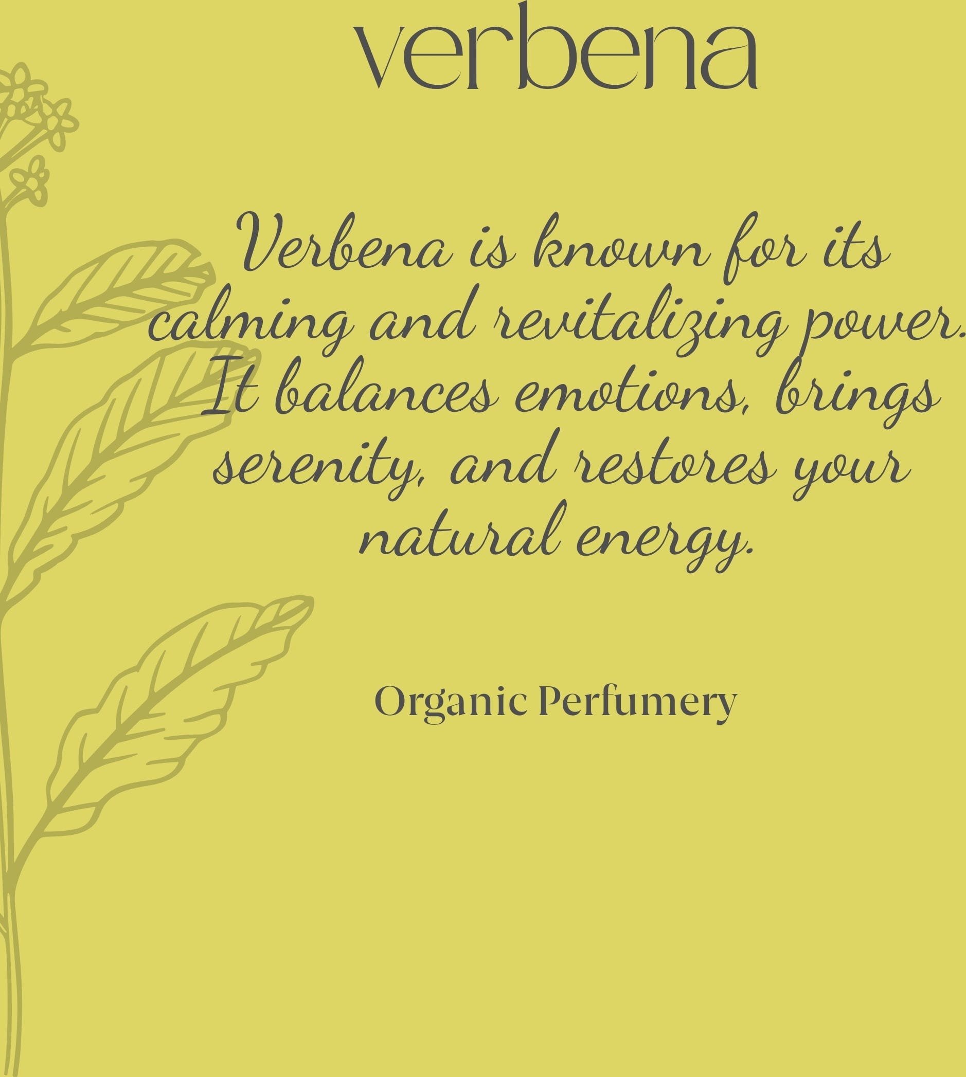 Erfüllt von der Kraft sowie Frische der Natur, des Meeres und des Strandes, überzeugt das Verbena Organic Fresh Fragrance mit seinen belebenden Aromen. Das EdC wird handgemacht und mit einem Zweig Bio-Thymian oder -Eisenkraut mazeriert - je nach Saison. Dies verleiht dem Duft eine noch natürlichere Note.