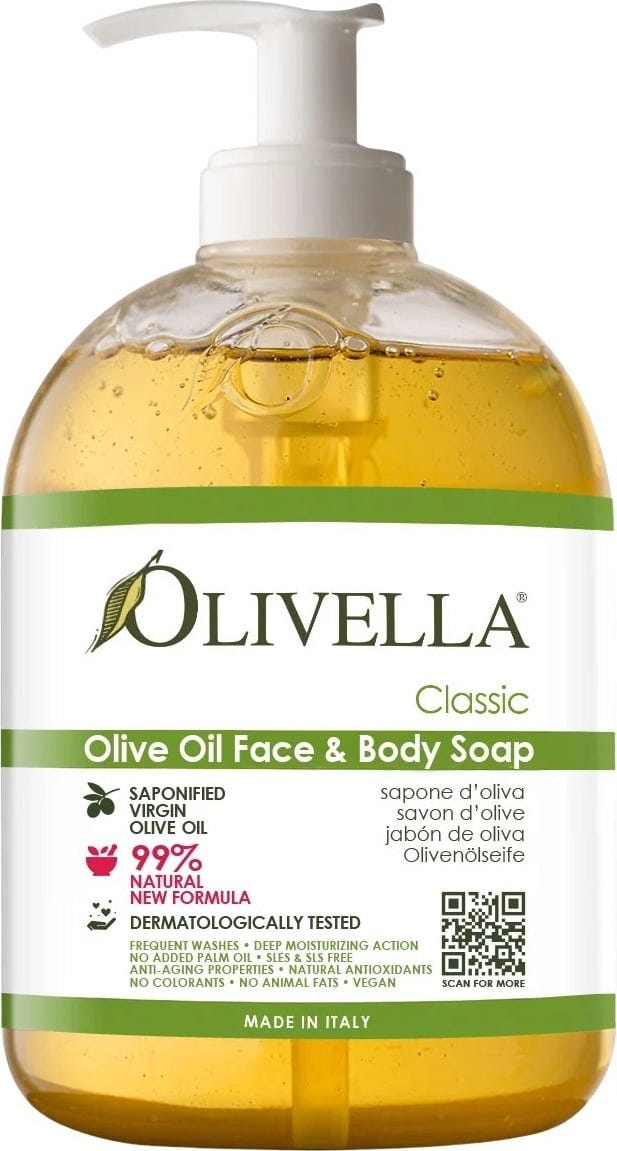 Diese Olivella Flüssigseife mit sanftem, mediterranem Duft wird aus reinem, nativem Olivenöl extra hergestellt. Über das spezielle Verseifungsverfahren bleibt das natürlich vorkommende Glycerin im Endprodukt erhalten, wodurch die Seife der Haut wertvolle Feuchtigkeit spendet. Sie kann nicht nur für die Hände, sondern für den ganzen Körper und auch das Gesicht verwendet werden. Die Formulierung ist vegan und frei von synthetischen Inhaltsstoffen.