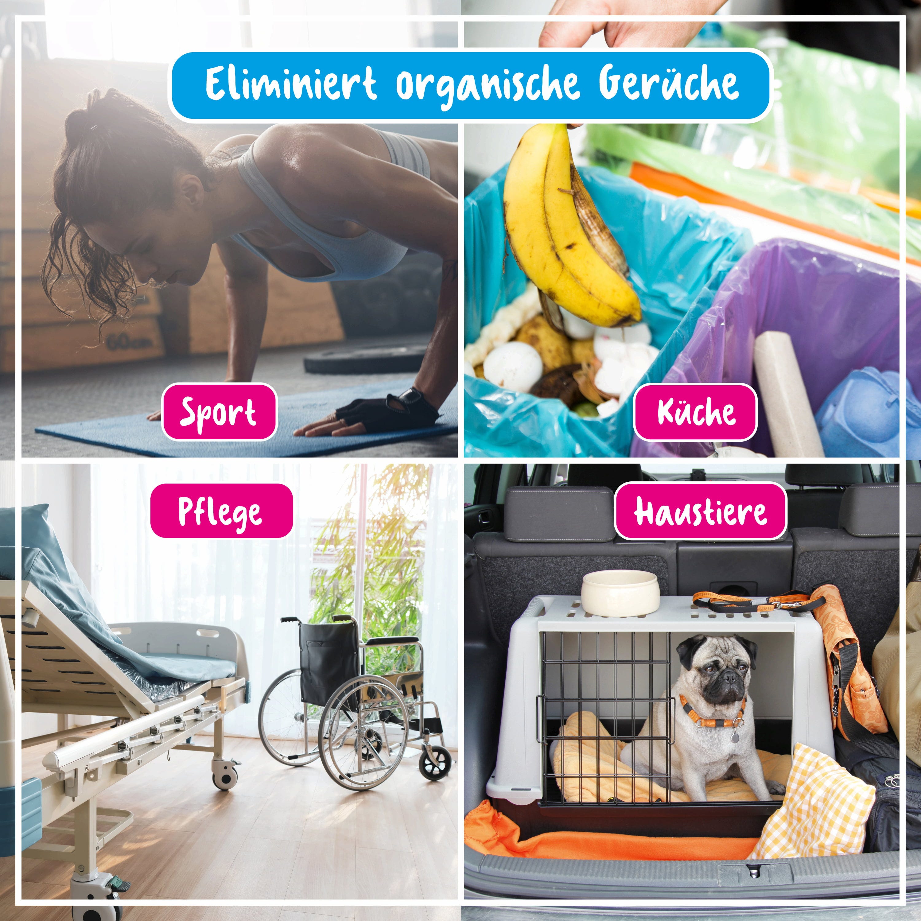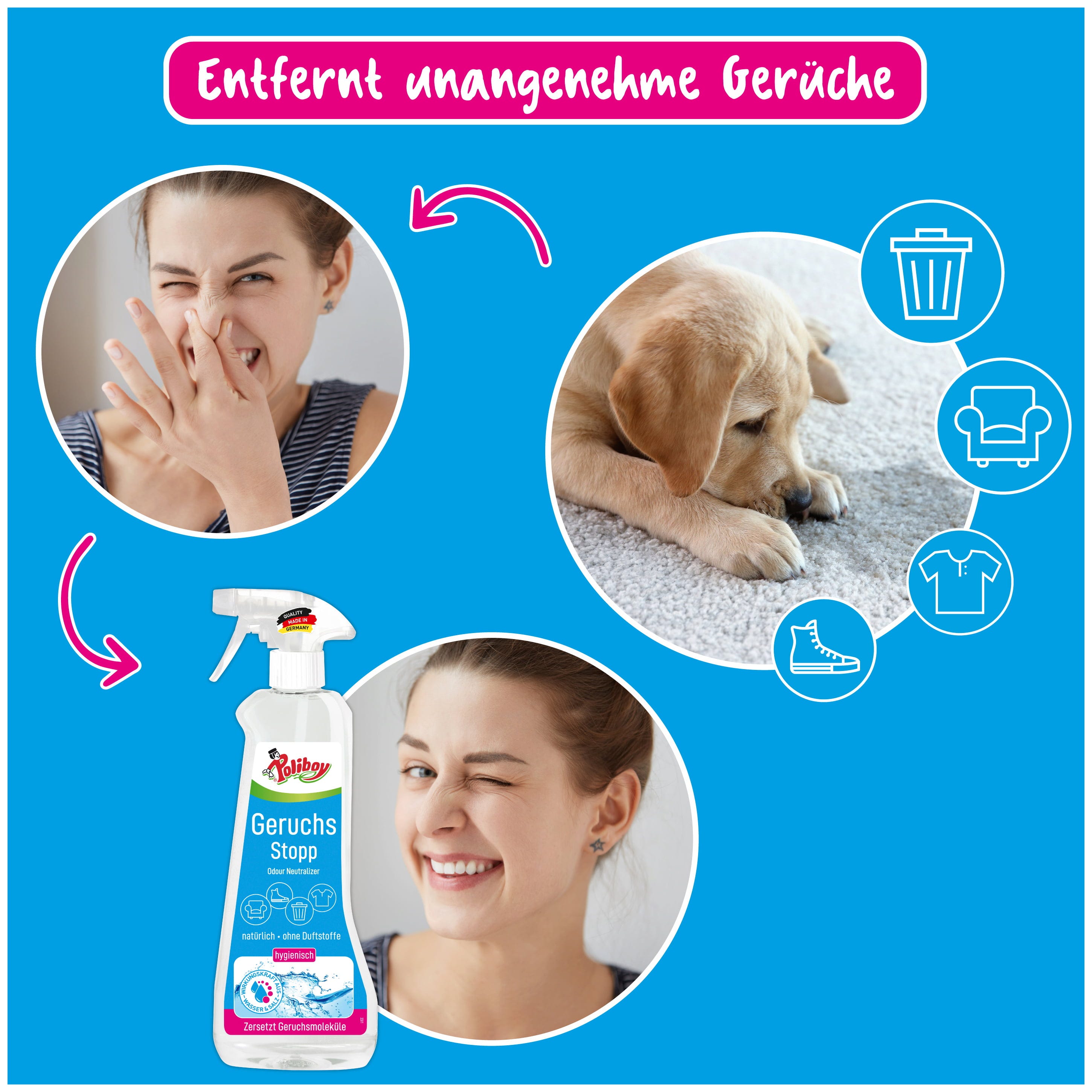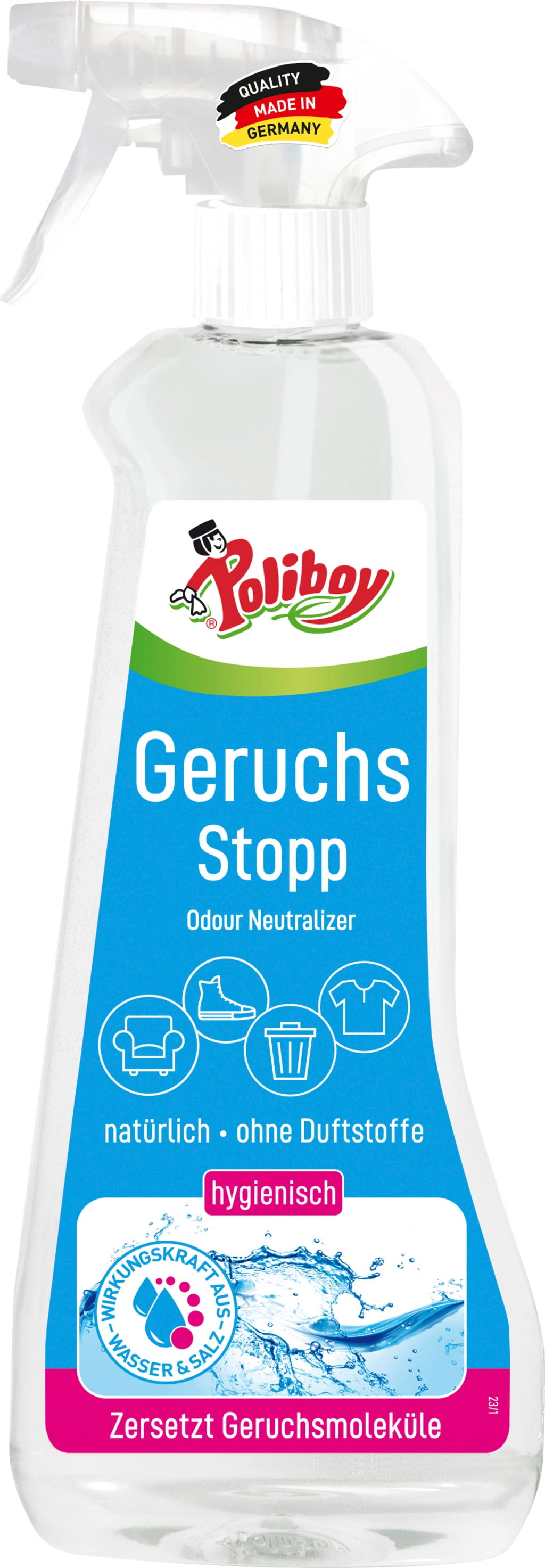 Der Geruchs Stopp von Poliboy unterstützt dich im gesamten Haushalt bei der Eliminierung von unangenehmen, organischen Gerüchen. Der Reiniger eignet sich für Kunststoff (z.B. Mülleimer) sowie unempfindliche Textilien (Teppiche, Yogamatten, Schuhe, ...) und beseitigt den Geruch nach Speiseresten, Urin, Erbrochenem und Schweiß. Die Formel mit elektrochemischen aktiviertem Wasser und Salz zersetzt die Moleküle anstatt sie zu überdecken, sodass für eine dauerhafte Neutralisation gesorgt ist.